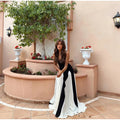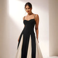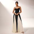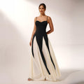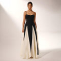 The flowing fabric moves beautifully with every step, while the contrasting black and cream palette creates a captivating, sculpted illusion that elongates and flatters the figure.